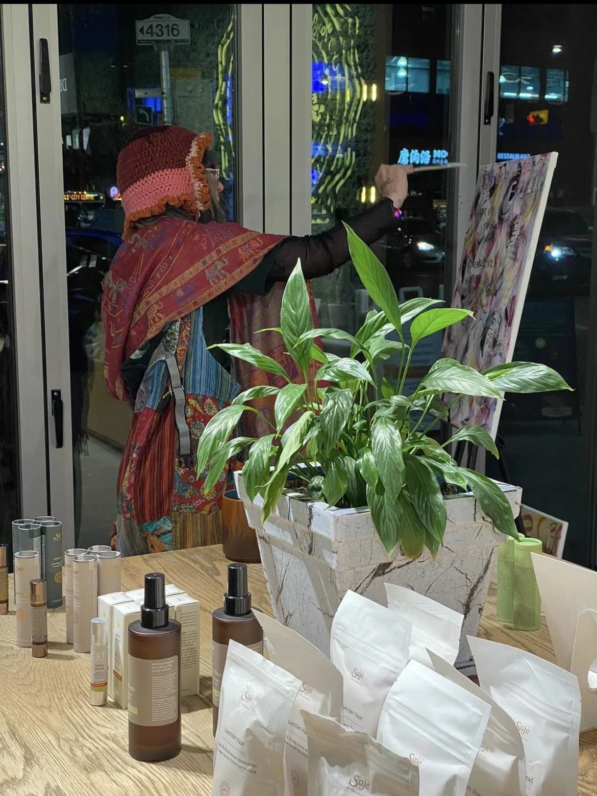 Performing live ritual painting within a market showcasing local vendors.